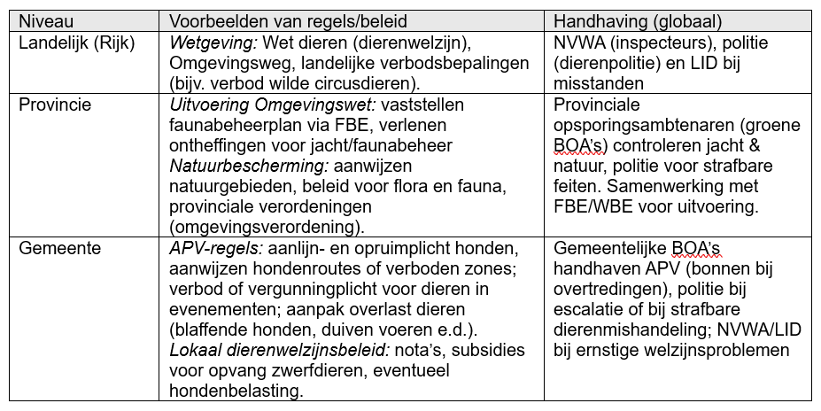 De gemeente kan zelf veel regelen inzake dieren zolang het gaat om de lokale openbare orde en leefbaarheid. Niet toegestaan is dat een gemeente eigenhandig in het domein van de landelijke wet duikt. Zo kan een gemeente niet in de APV besluiten “het is verboden een dier te mishandelen” – dat is al verboden in het Wetboek van Strafrecht en de Wet dieren. Wel kan de gemeente beleid maken om dierenwelzijn te bevorderen (voorlichting, subsidies voor sterilisatieacties, steun aan dierenambulance, etc.), maar het juridisch afdwingen van dierenwelzijnsregels blijft een nationale zaak. Om die reden zie je dat APV-regels altijd met openbare orde, veiligheid of hygiëne worden gemotiveerd.