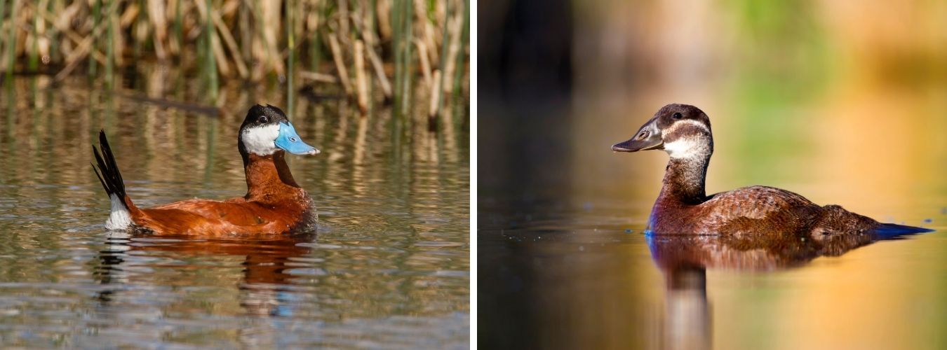 Links op de foto: een rosse stekelstaart (man) en rechts een vrouwtjes witkopeend.
