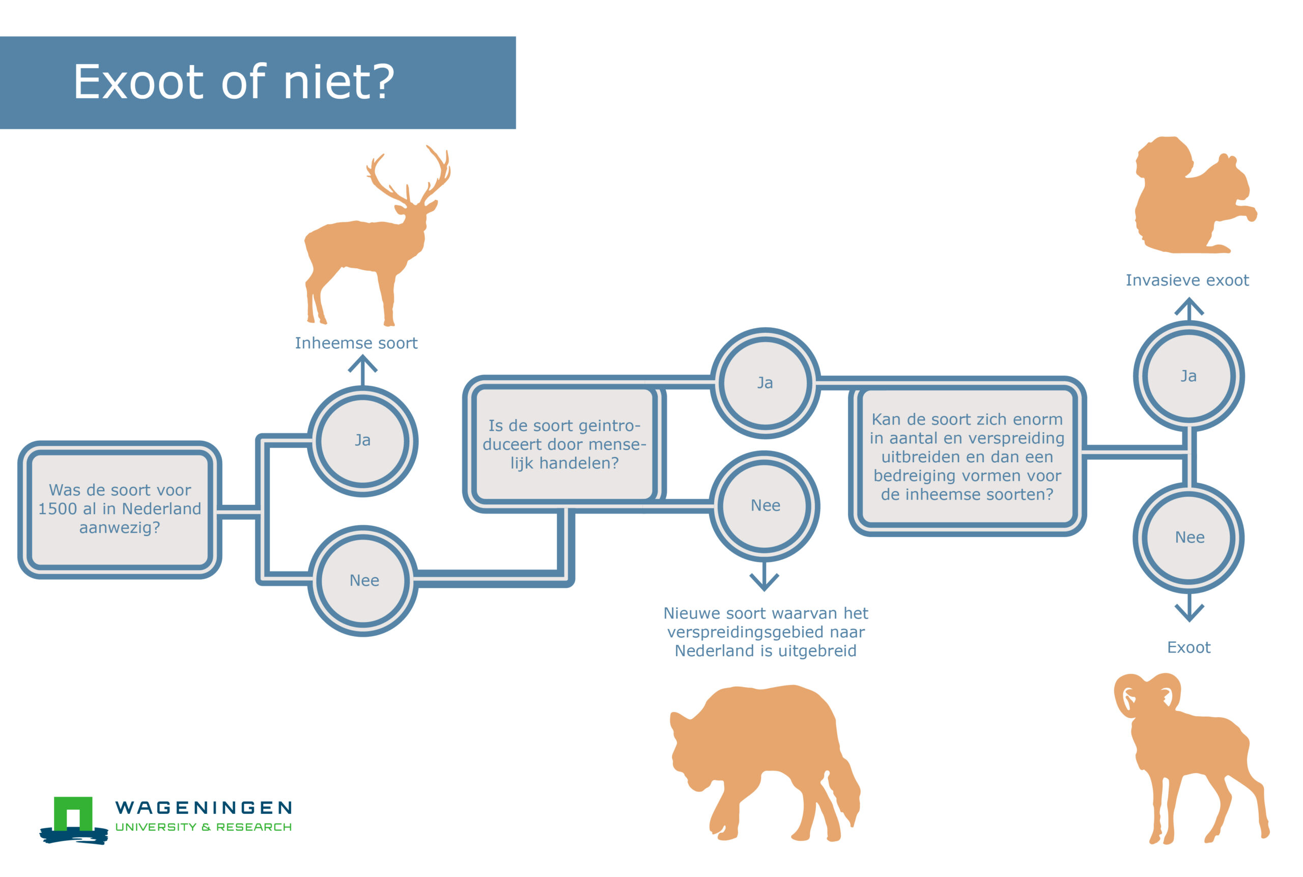 De afbeelding hieronder is van de WUR. Hierop is via het stroomschema duidelijk gemaakt of er sprake is van een (invasieve) exoot of niet. Uit deze afbeelding wordt ook duidelijk waarom de wolf geen invasieve exoot is.