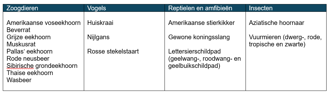 We zullen niet alle invasieve exoten (dieren) bespreken. In onderstaand overzicht staan de meeste invasieve exoten waar je als dieradviseur mee te maken kan gaan krijgen. Een paar worden hieronder uitgewerkt omdat je daar regelmatig(er) mee te maken kunt krijgen.
