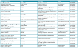 Reptielenopvangcentra: Reptielen en amfibieën worden opgevangen door o.a. Reptielenopvang Zwanenburg, Stichting Herpetofauna (Nijkerk) en Stichting Iguana (Vlissingen). Soms worden zeer giftige soorten elders ondergebracht.