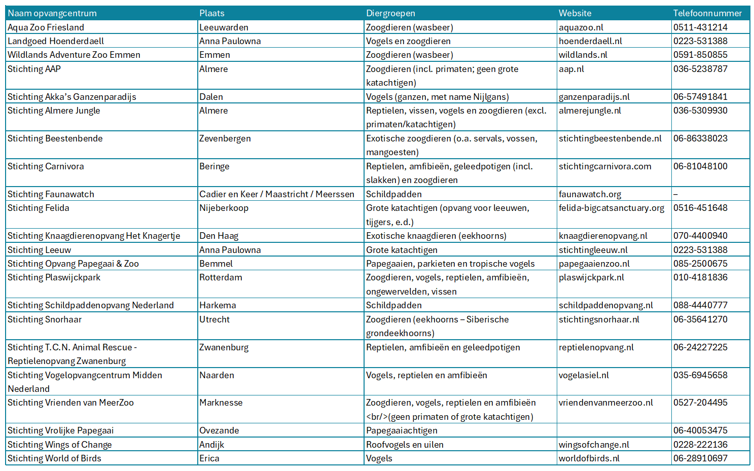 Stichting AAP (Almere): Opvang van exotische zoogdieren zoals apen, katachtigen en wasberen. Veelgevraagd bij gemeenten en in beslagnamezaken. Beperkte capaciteit; werkt samen met buitenlandse opvangplekken.